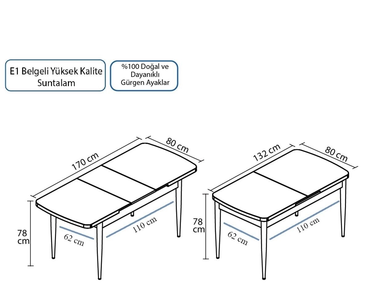 DEREN HOME | Mabel Serisi, 80x132 Mutfak ve Yemek Masası Takımı + 6 Adet Sandalye